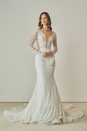Yüksek yaka tül gövdesi, çiçek işlemeleri ve öndeki zarif yırtıcıyla modern bir duruş sunan akıcı bir gelinlik modeli.